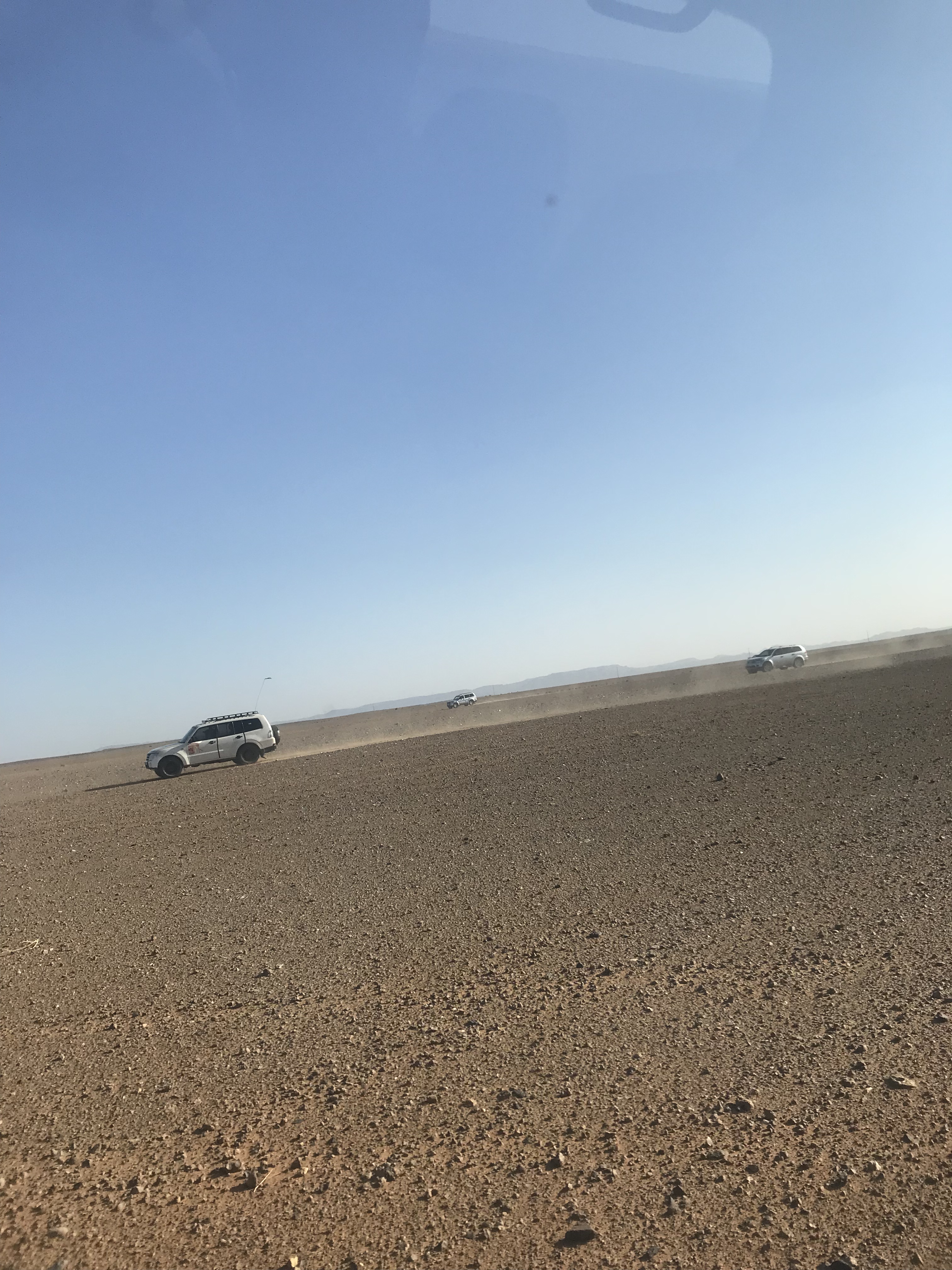 There is no way to discern direction, save the strange mass of darker blue in the distant sky. Like a flock of birds there is one jeep in charge of the direction, while everyone else flash the whites of their eyes to check sidelong.