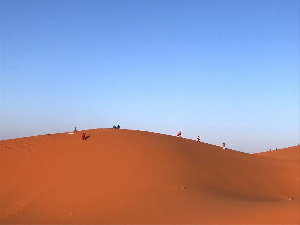As we rumbled further the blue starts to tinge red like a mountain has caught fire, so gradually that it might appear sudden if inattentive. Closer yet, it becomes a pink blush against the horizon, then the dunes proper rise golden and smooth, dollop of whipped cream.