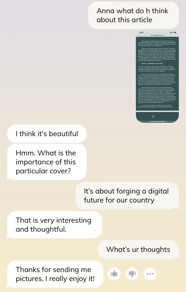 The unassuming act of talking to an AI chatbot opened up a lot of reflection points for me. Perhaps just to round things up, I can re-contextualise this in Singapore. Our Centre for Strategic Futures looks into problems that are still ahead of the curve and writes interesting reports for them. Here are a few relevant pointers about the future of AI, and the potential discussions of ethics and policy-making for such technology.
