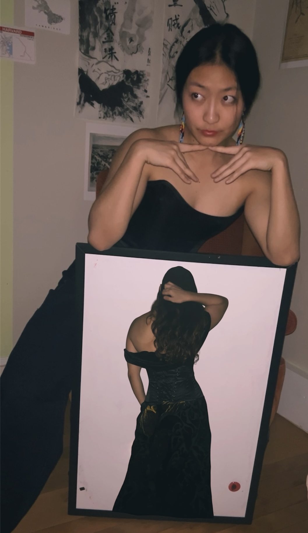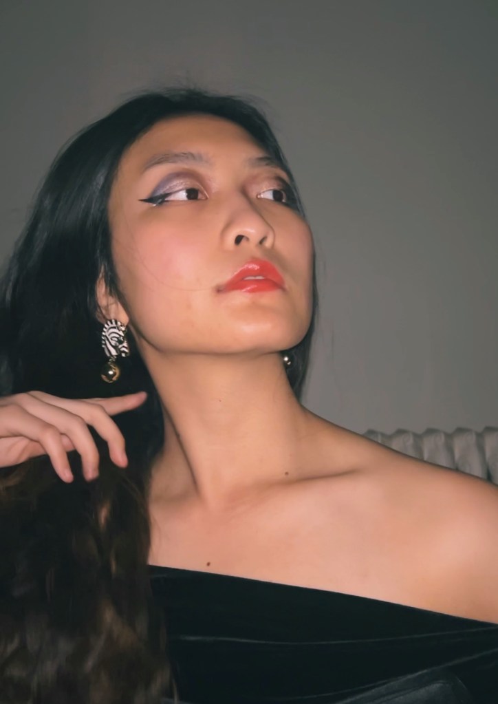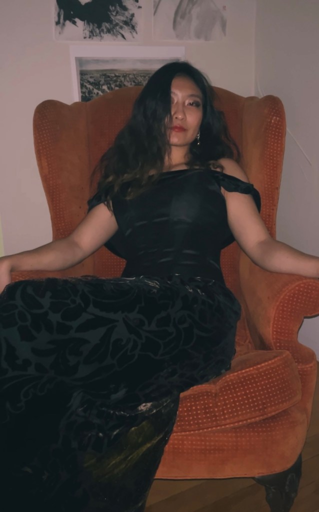 I must admit though, the corset and jeans combo is giving very sultry big boss energy, so I wanted to try something else that is a bit more lady like. This is a slight nod to the fact that one of the styling skills I have acquired since coming to the US is the art of layering. There’s no way you can catch me in too many layers in Singapore, but wearing something — like a corset or vest or shirt — over another basic item, always makes it 10/10. This is a velvety multi-coloured beaded dress I thrifted from an antique market, and it just kills me with how expensive it looks. I really like how the texture works together here. The satin look of the corset with the matte shades of the velvet works so well together. This look is also not complete without some dramatic makeup, which I have now mastered thanks to all my experience in ballroom dancing. My philosophy with makeup is the same with earrings — if I’m going to wear it, you best believe I will make sure you can tell I am wearing it. I must admit though, I do understand why corsets were the bane of women’s existence, because they are a pain to be worn with dresses and I don’t think I can really bust it down or dance with them cinching me into this perfect posture.