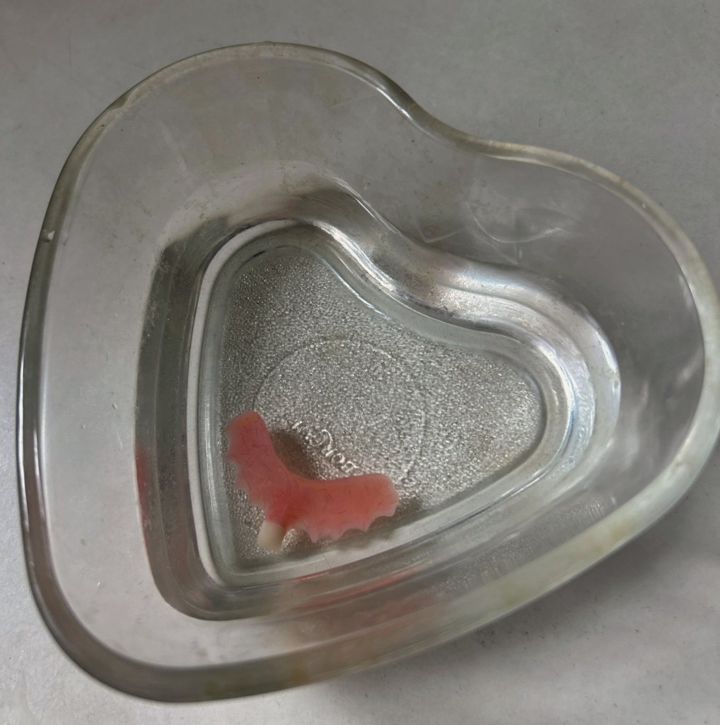 My mother wears a singular tooth in her gummy dentures